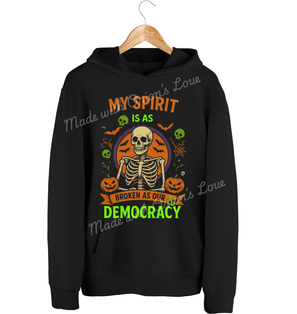 Feeling like your faith in government is about as sturdy as a wet paper straw? Same. The Broken Spirit hoodie says exactly what we’re all thinking but with a sarcastic Halloween twist: “My Spirit is as Broken as Our Government.”