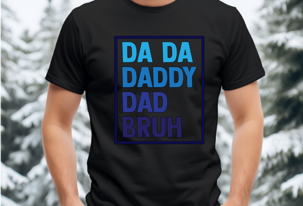 Celebrate the hilarious and heartfelt evolution of fatherhood with the "Da Da Bruh!" design. Perfect for dads who’ve lived the journey from being the adorable "Da Da," to the loving "Daddy," to the dependable "Dad," and finally to the relatable "Bruh." This design captures every stage with humor and style, making it a standout piece for dads of all ages.