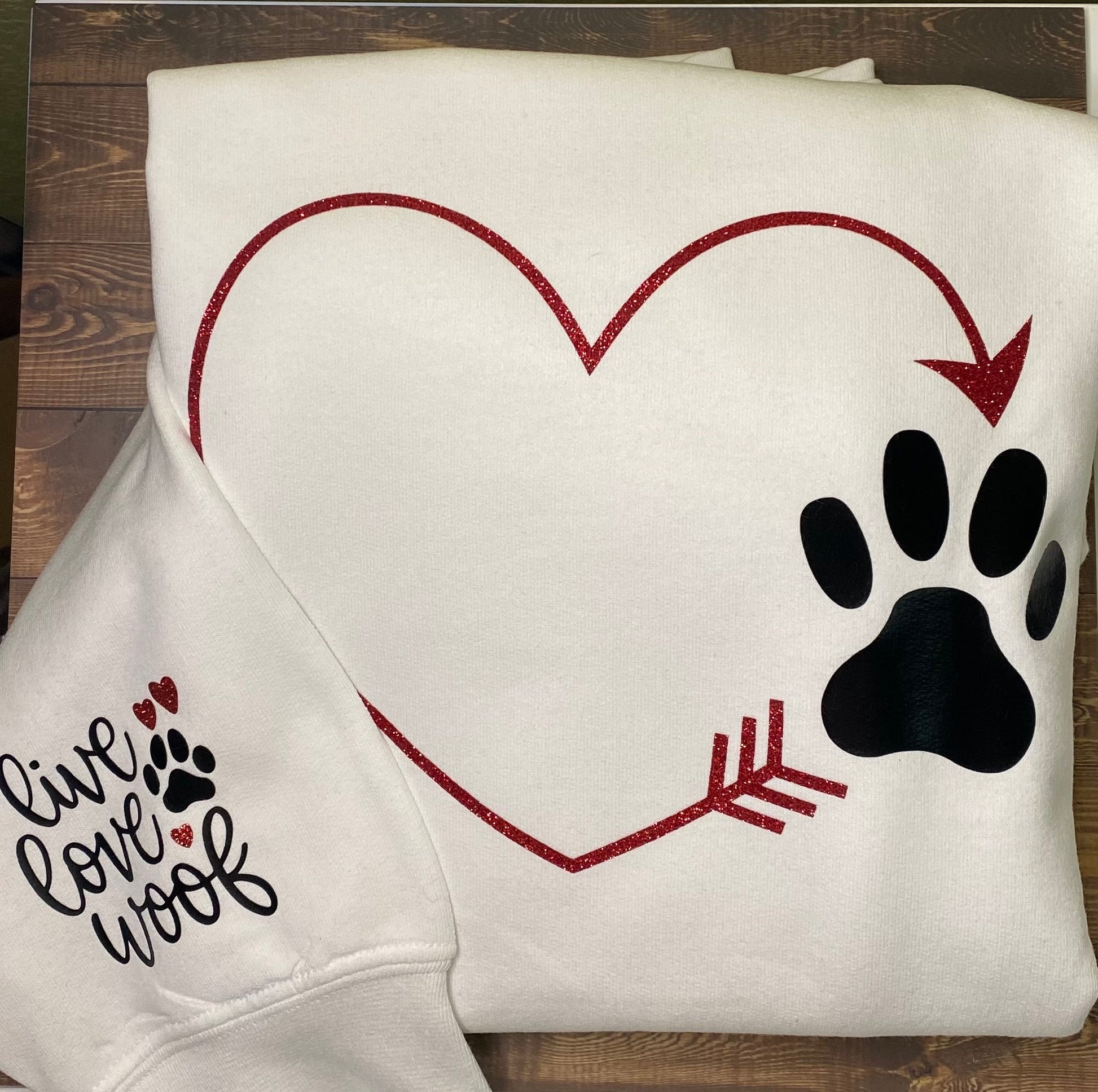 Fun sweatshirt design! Perfect to pair with your favorite jeans or leggings. Graphic says "Live Love Woof" on the sleeve and features a large black paw print and gorgeous red glitter heart. The print is heat applied for durability. A fun gift for any dog lover!