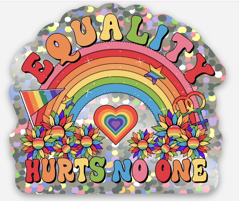 Spread a message of love and inclusion with our Equality Hurts No One sticker! Featuring a holographic background that shimmers with every tilt, this design radiates positivity with rainbows, pride flags, vibrant flowers, stars, and hearts. It's a beautiful reminder that equality uplifts everyone and hurts no one. Measuring 2 inches wide by 1.78 inches tall, this eye-catching sticker is the perfect size for laptops, notebooks, or water bottles, adding a bit of sparkle and a whole lot of heart to your everyday. Stand for equality and celebrate diversity with a sticker that shines just as bright as the message it carries!