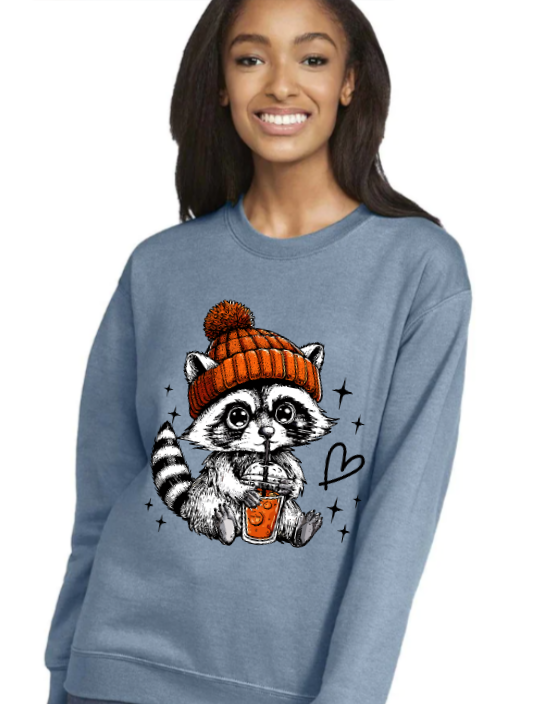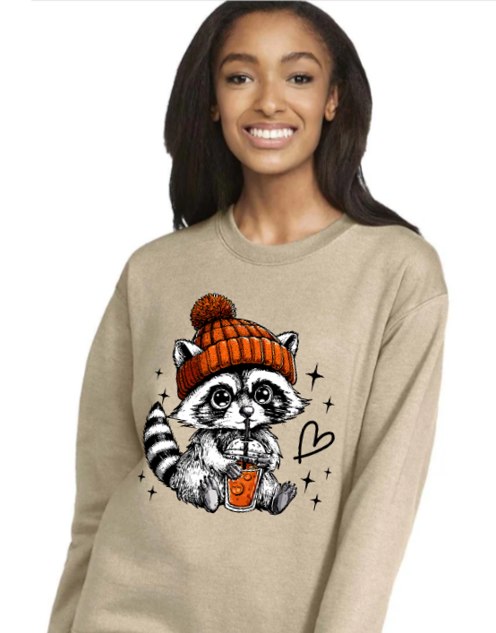 Get cozy this season with the "Fall Time Raccoon" sweatshirt, a perfect blend of comfort and cuteness for those crisp autumn days. This Gildan Softstyle sweatshirt, available in sand and stone blue, features an adorable raccoon bundled up in a winter beanie, sipping on a pumpkin-flavored drink.