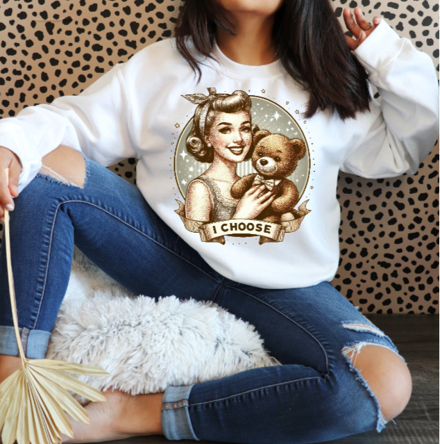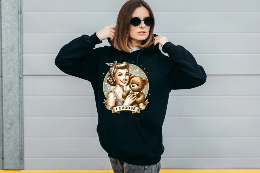 Make a bold statement with our I Choose sweatshirt/hoodie, designed for those who proudly choose strength, loyalty, and untamed spirit over convention. Featuring a classic, artistic image of a woman holding a bear, this design radiates empowerment and independence. Rendered in warm, earthy shades of brown, it offers a fresh twist on traditional greyscale, adding depth and a sense of resilience. This cozy sweatshirt/hoodie is perfect for showcasing your fierce spirit and unapologetic choices. Wear it as a reminder that sometimes, the wild heart wins—and you'd choose the bear every time. Ideal for lovers of symbolism and those who walk their own path.