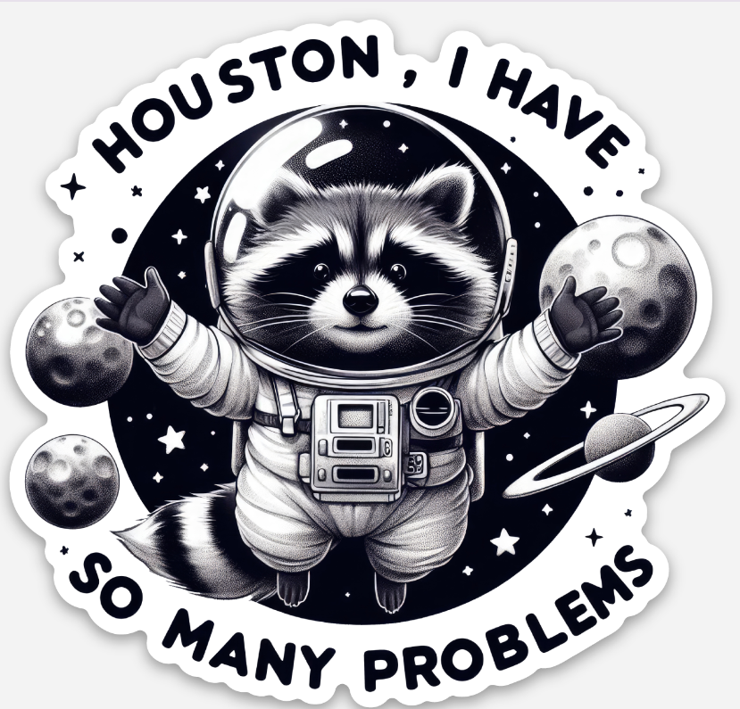 Meet your new spirit animal with our I Have so Many Problems sticker! Featuring a raccoon decked out in full space gear, floating in the vastness of outer space and basically calling Houston, this sticker perfectly captures the chaos and humor of life’s little (and not-so-little) dilemmas. Rendered in striking grayscale colors, this 3x2.88-inch sticker is a perfect fit for your laptop, water bottle, notebook, or any spot that needs a touch of cosmic comedy. Whether you're embracing your inner space cadet or just laughing at life’s complexities, this sticker is here to remind you—you’re not alone in orbit!