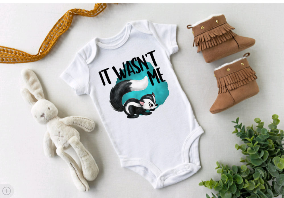 Introducing the adorable and playful "It Wasn't Me" onesie/shirt for kids featuring a cute skunk on the front! This onesie/shirt is perfect for any little one who loves animals and wants to show off their mischievous side.