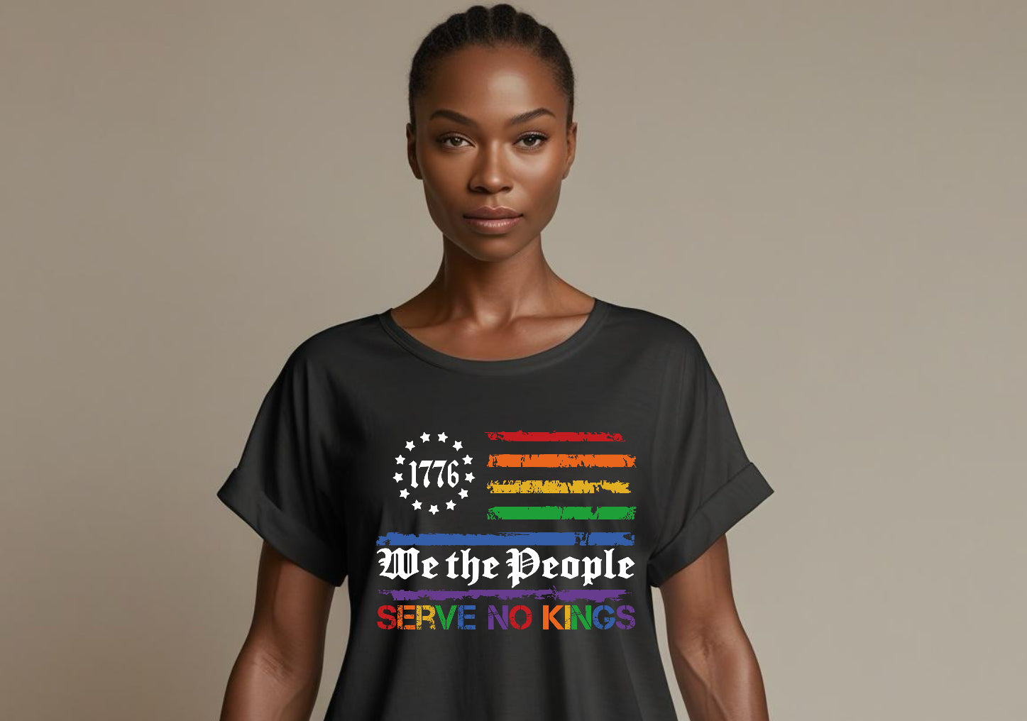 Front and center is a powerful graphic: “1776” encircled by thirteen stars, a nod to the original colonies who stood up to tyranny. Beneath it, the iconic American stripes are reimagined in vibrant rainbow colors, honoring the diversity and freedom that define our modern democracy. And anchoring it all is a fearless statement in bold lettering: “We the People Serve No Kings.”