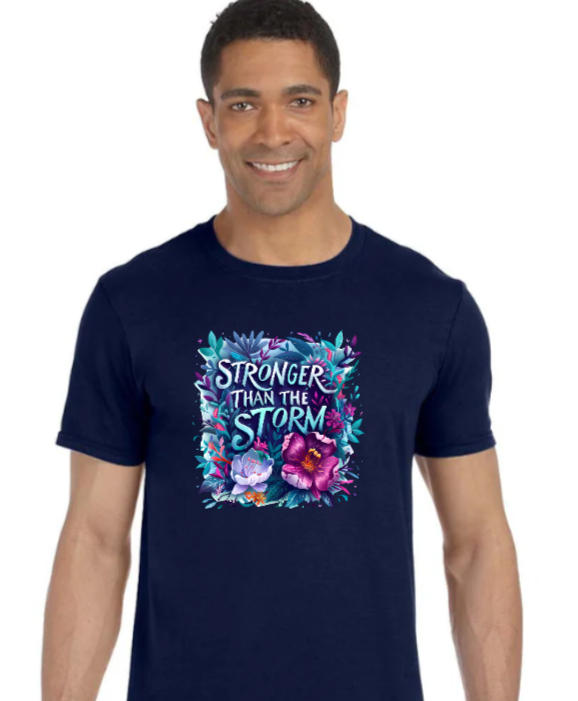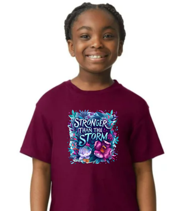 Introducing the "Stronger Than the Storm" collection, available in adult and youth sizes. This empowering design features a vibrant maroon and navy blue color palette, with a bold statement that reminds you of your inner strength. The elegant floral accents add a touch of beauty and grace, making this piece not just apparel, but a source of inspiration.