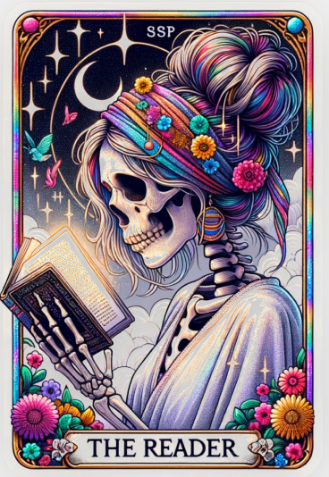 "Meet The Reader, a sticker for those who find magic in the pages of a book! Featuring a delicate, skeletal figure immersed in a story, this design captures the quiet mystery of nighttime reading, with a deep, starry night as the perfect backdrop. Vivid flowers bloom around her, bringing pops of color and life to the scene. With its clear background, The Reader blends seamlessly on any surface—be it your laptop, journal, or water bottle. Measuring 2 inches wide by 3 inches tall, it’s a small but enchanting addition to your collection, made to celebrate the beauty of quiet moments and endless imagination."