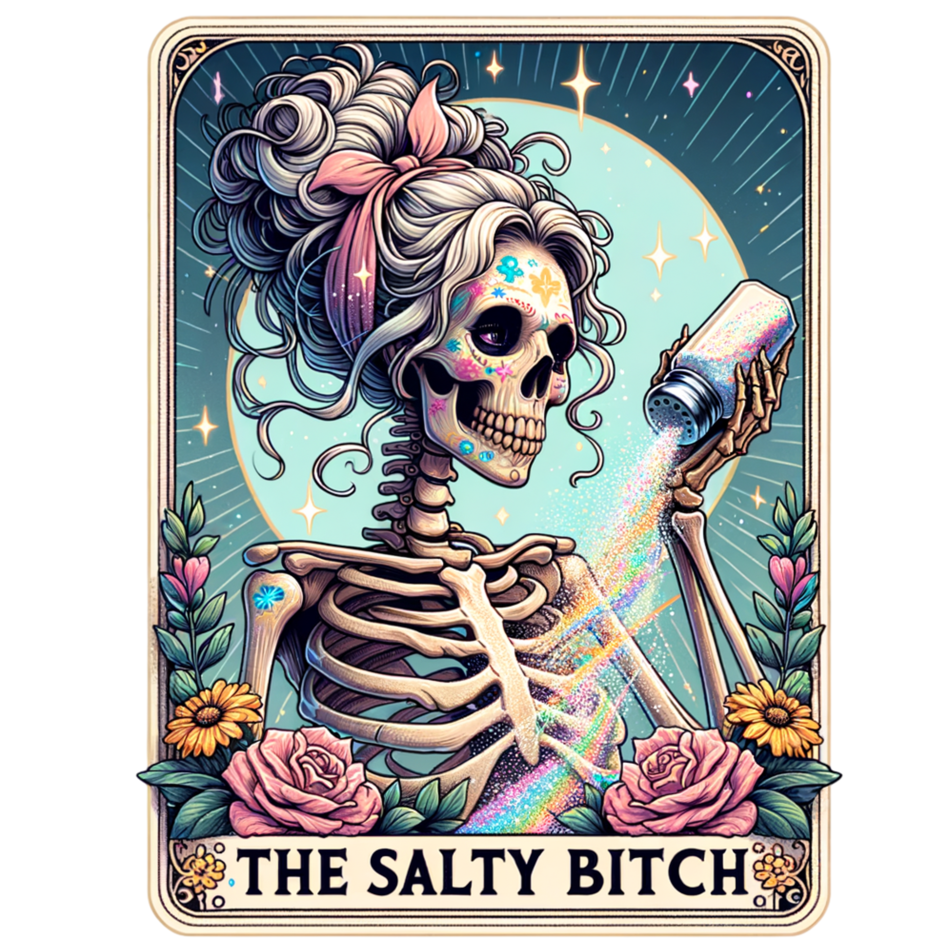 Introducing The Salty Bitch, a sticker with a twist of attitude! This design features a sassy skeleton pouring salt, creating a vibrant rainbow backdrop that’s as bold as it is fun. Colorful flowers accent the scene, adding a splash of whimsy to this one-of-a-kind design. With a clean white background, The Salty Bitch stands out beautifully on notebooks, laptops, and any dry surfaces that need a little extra flavor. At 1.5 inches wide by 2.5 inches tall, it’s the perfect size for adding a touch of personality to your everyday items. Just remember: keep it away from water!