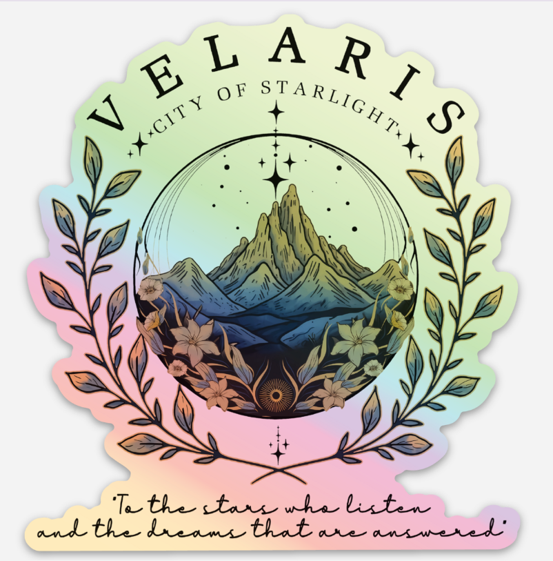 Reach for the cosmos with our To The Stars Who Listen sticker, designed for fans of dark MMCs and enchanting fantasy worlds. Set against a breathtaking holographic background, this design showcases the mystical City of Velaris with its stunning mountain backdrop, radiating an ethereal glow. At 3.7 inches wide by 4 inches tall, it’s the perfect size for adorning your laptop, journal, or any space that craves a touch of magic. This sticker is not just a visual delight; it’s a reminder to dream big and embrace the stories that inspire us. Let your imagination soar and celebrate the beauty of fantasy with every glance!